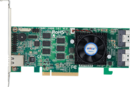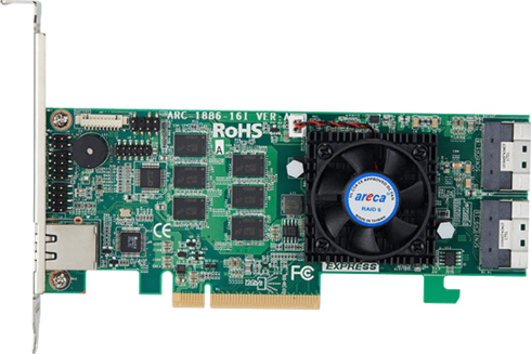 Das Low-Profile-Modell ARC-1886-16I hat 16 interne Ports (zwei SFF-8654 x8) eingebaut und verfügt zudem – wie alle RAID-Controller der Serie – über einen Out-of-Band LAN-Port.