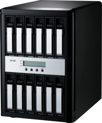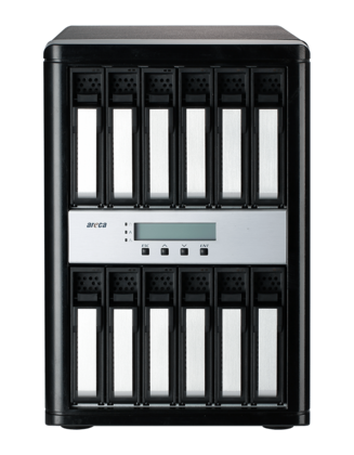 Areca's ARC-8042-12 provides large capacities in a small footprint as a SAS-to-SAS desktop RAID subsystem. Up to 12 Serial-Attached SCSI (SAS) drives at 12 Gbps or 12 Serial ATA (SATA) drives at 6.0 Gbps can be accommodated in this external storage enclosure. The high-performance dual-core ROC processor, 2GB RAM memory architecture and 12 Gbit/s SAS technology ensure high performance in the workflow.