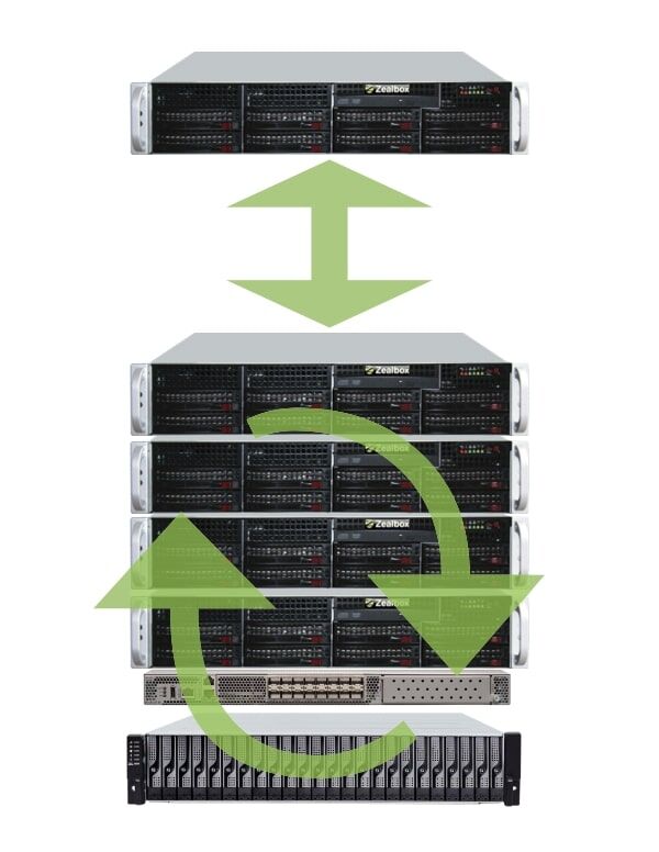 Das daraus entwickelte Konzept umfasst fünf unserer Z50-Server, die über schnelle Cisco-Switches auf das 80 TB Shared All-Flash Storage von Infortrend zugreifen. Die Absicherung übernimmt ein weiterer Z50 Server, der außerhalb des Rechenzentrums über eine 400 Mbit Leitung die wichtigsten lokalen Systeme repliziert.