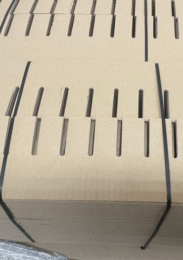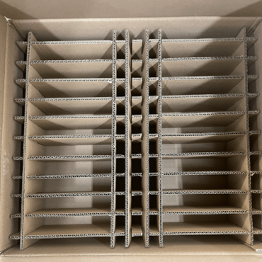 Auch unsere Gefache – die Trenngitter zur Transportsicherung – sind bei uns nun aus Pappe statt aus Kunststoff.