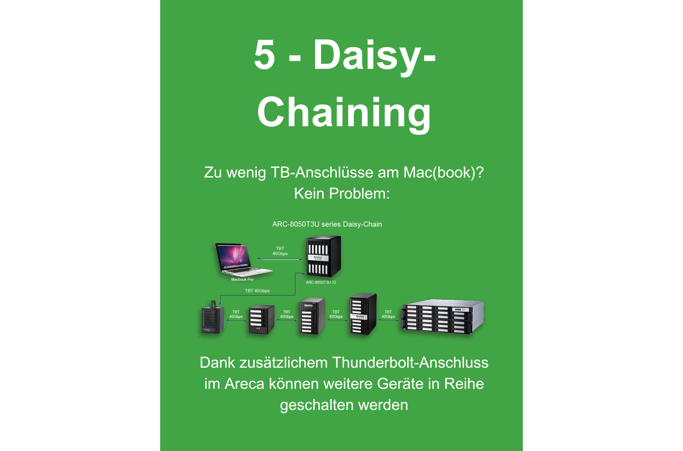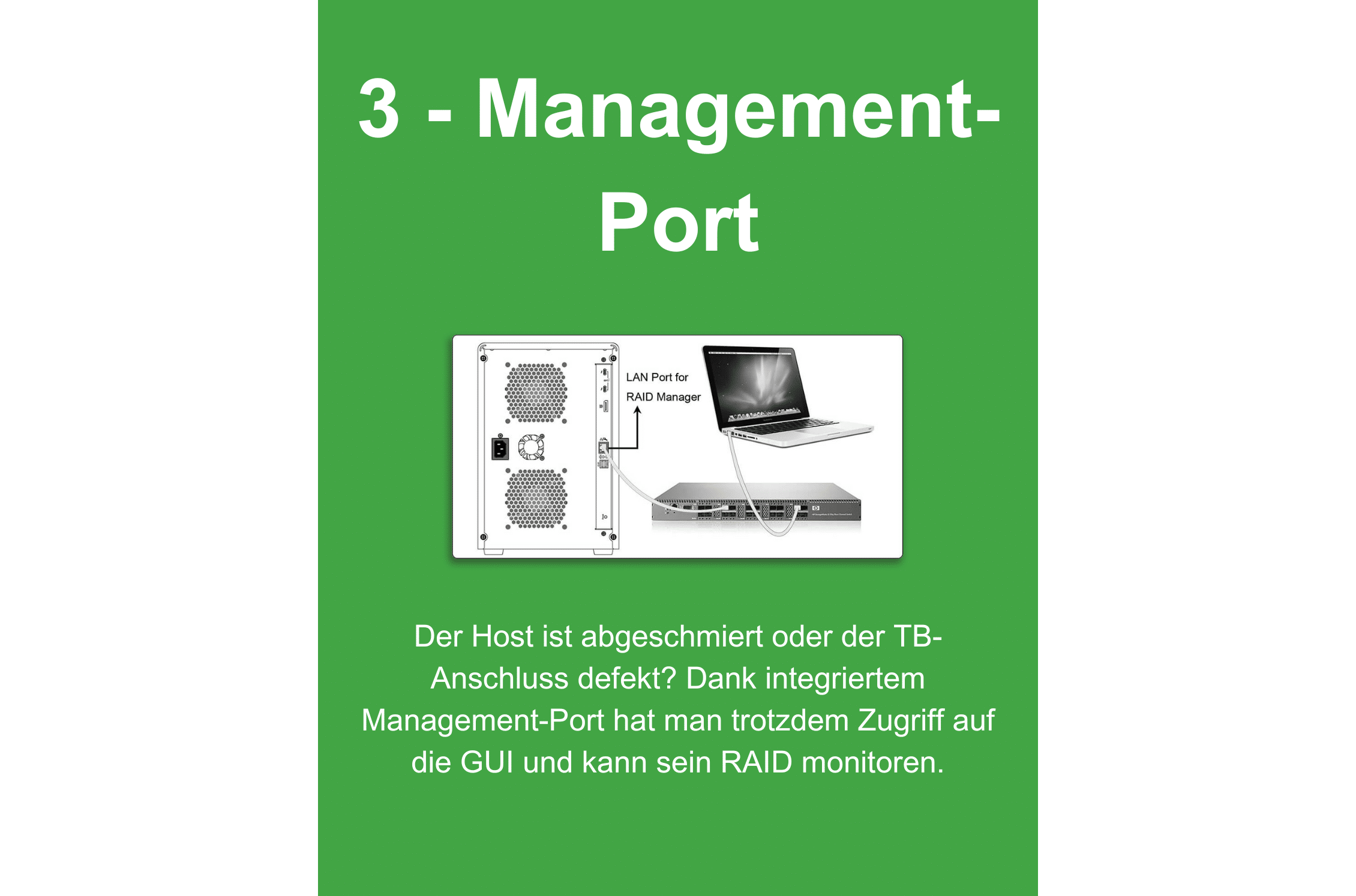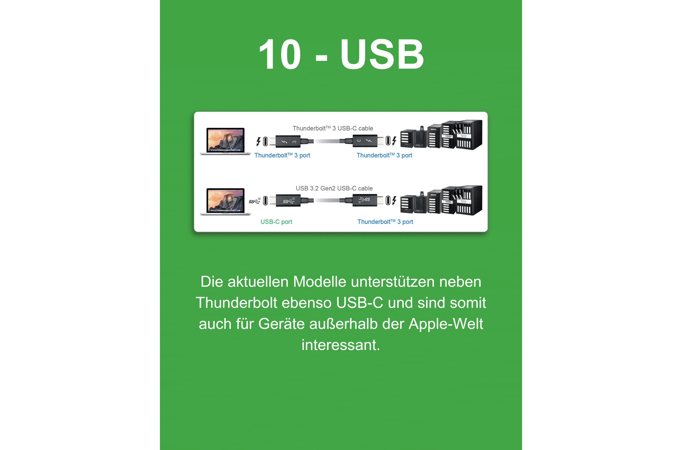 Die raffinierte Storage-Box beherrscht über einen einzigen Anschluss USB 2.0, USB 3.2 Gen1, USB 3.2 Gen2 und Thunderbolt 3. Es gibt die schnellen RAID-Systeme mit 4, 6, 8 und 12 Laufwerkseinschüben. Als betriebssystemunabhängiges Storage-System gelingt die Installation ohne zusätzliche Software oder Treiber. Für die nötige Sicherheit der darauf gespeicherten Daten unterstützt es RAID Level 0, 1, 10, 3, 5, 6, Single Disk oder JBOD.