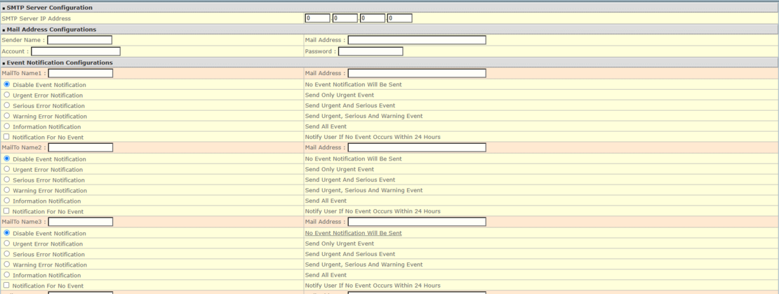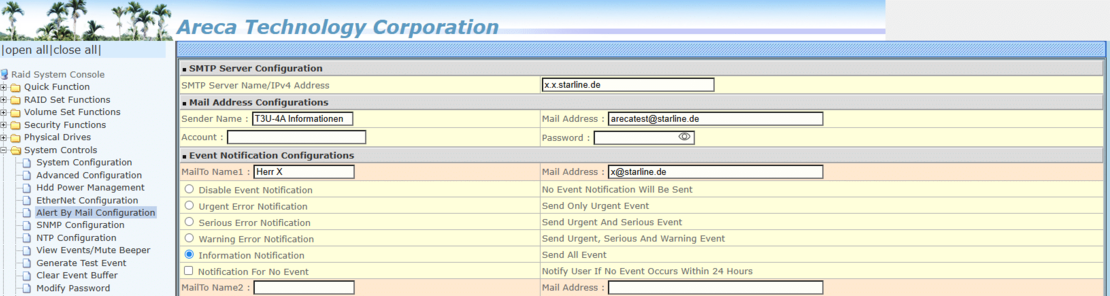 Dadurhc erkenn Sie, dass die Benachrichtigungs-E-Mail genau von dem dementsprechenden Areca-Gerät stammt. Unter Warning Error Notification bekommen Sie dementsprechend jedes mal eine Meldung für die drei relevantesten Events: Urgent, Serious und Warning-Events Dann sind die wichtigen Fehlermeldungen festgelegt. Somit müssen Sie es nur einmal eintragen, um alle relevanten Meldungen gleichzeitig abzudecken.