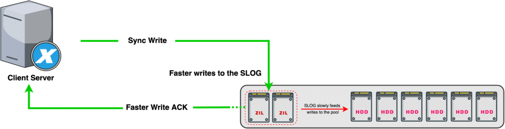 Als Mittelweg zwischen dem ausschließlichen Verlassen auf RAM und asynchronen Schreibvorgängen als auch dem Warten auf langsame, sich drehende Festplatten, die die Transaktionsdaten auf ihre Platten schreiben, kann ZFS einen schnellen, nichtflüchtigen Speicher (SSD) verwenden, um die Transaktionsdaten aus dem RAM auf das Gerät zu schreiben und dem Client dann mitzuteilen, dass die Daten gespeichert wurden. In diesem Szenario sind die auf die SSD geschriebenen Daten selbst bei einem Systemabsturz oder einer Stromunterbrechung noch vorhanden, nachdem das System wiederhergestellt wurde.