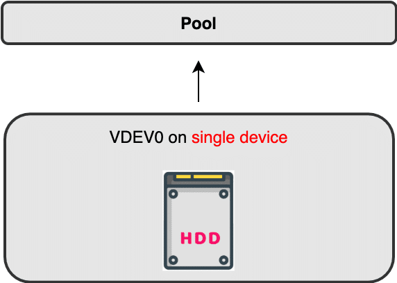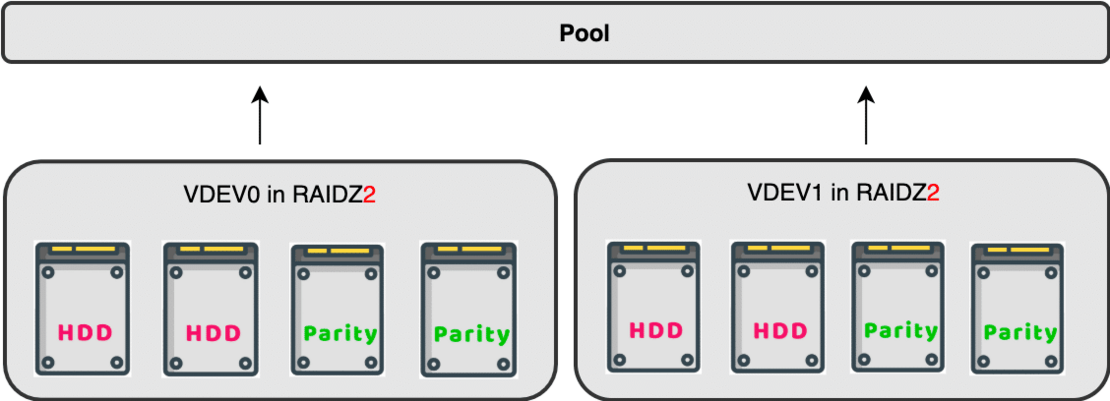 In jeder ZFS-Speicherlösung werden Ihre Daten in einem ZFS-Pool (kurz: ZPool) gespeichert. Dieser ZPool besteht aus einer oder mehreren virtuellen Gerätegruppen (VDEVs), diese VDEVs bestehen aus physischen Festplatten (Geräten). Wenn mehr als ein VDEV im Pool vorhanden ist, werden die Daten immer verteilt. Das bedeutet, dass jede Festplatte, die Sie an Ihren ZFS-Server anschließen, zu einem VDEV gehören muss.
