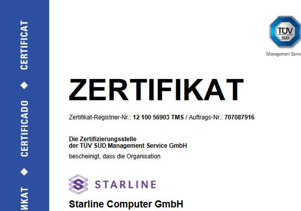 Starline hat erneut die Zertifizierung nach der internationalen Norm DIN EN ISO 9001:2015 absolviert und bestanden.